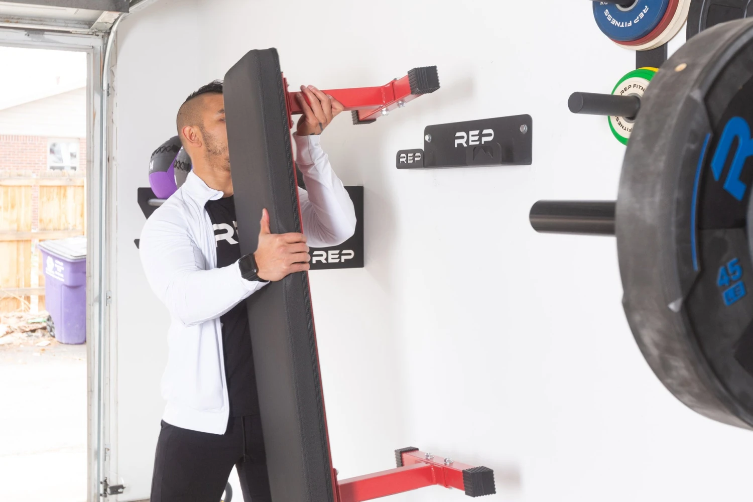 Grooved, rubber feet help keep the bench from sliding, while also protecting the floors. The FB-3000 is compatible with REP’s wall-mounted bench hanger, so you can store it up and out of the way to save space. The vertically mounted hanger is easy to install securely into studs or concrete, with 16”-spaced mounting holes, and the hanger is compact, at less than 4” deep. The FB-3000 is a cost-effective flat bench suitable for a wide variety of exercises.