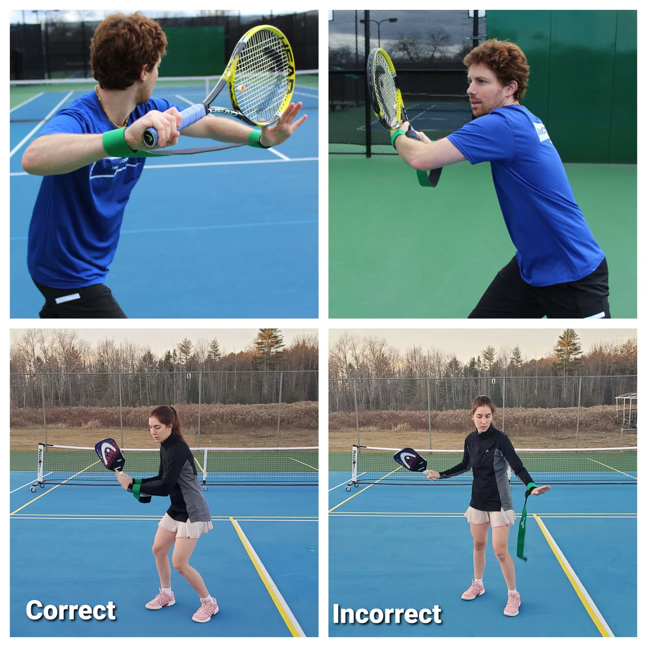 Too many players incorrectly hit forehand groundstrokes with an isolated arm motion and their shoulder as the center of rotation. Through scientific studies, we now understand that the entire body must efficiently work as a unit to hit an optimal forehand, a stroke with maximum power and control, yet without excessive effort. Along with ground forces (bending in the knees), body rotation is a very important key to a better forehand. The Forehand Fixer guides beginners to “feel” the correct biomechanics, right from the start. Intermediates looking to improve will always gain a faster “feel” for the correct swing as well. Simply place the Velcro around both wrists with the logo pointing upwards when your palms point down. Hit balls softly at first to feel how both arms should work together and the body should rotate or coil in preparation for the shot and uncoil afterwards. The Velcro should not be pulled apart during your swing. After a few shots with the Forehand Fixer in place, try hitting without it and make sure your corrected swing pattern is maintained. If not, repeat the process.