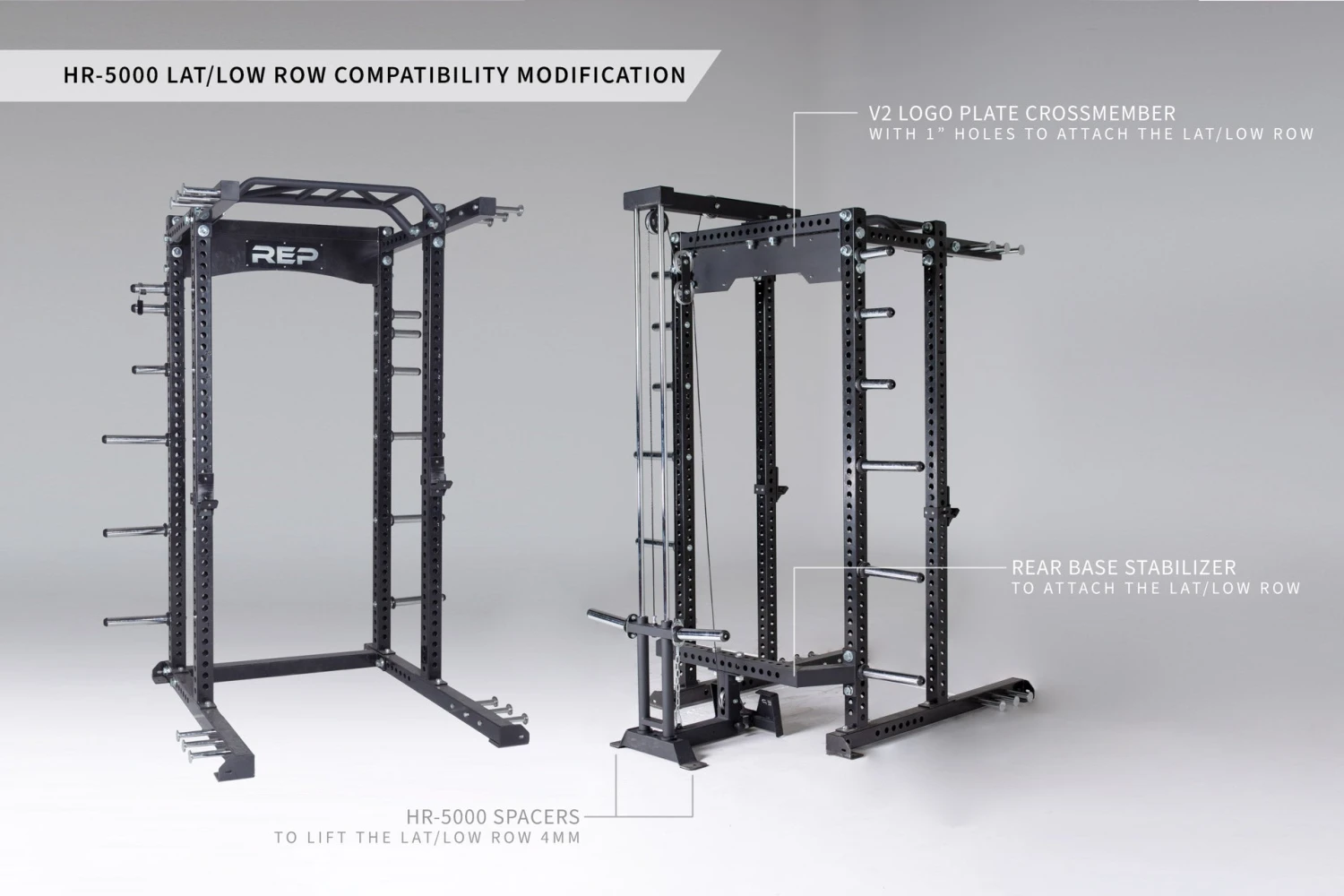 These spacers require the logo plate crossmember and rear base stabilizer to allow for the addition of the 5000 series Lat Pulldown and Low Row Attachment.