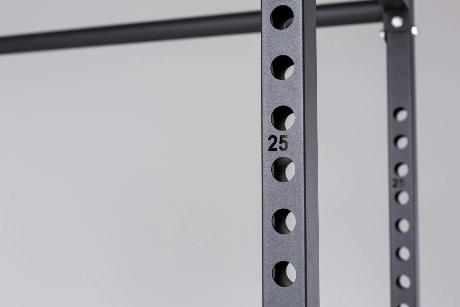 The PR-1000 is an affordable but sturdy power rack that’s compact enough to fit in even a space-restricted home. At 83” tall and 48” deep, the rack can fit in a spare room or basement, but its 14-gauge steel frame can handle a workload of 700lbs. It also features dual pull-up bars (1.25” and 2” thick), great for partner workouts or additional grip challenges. Keep organized with built-in weight storage pegs on the back base, which also add stability to the cage.