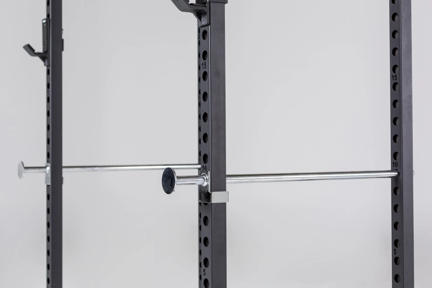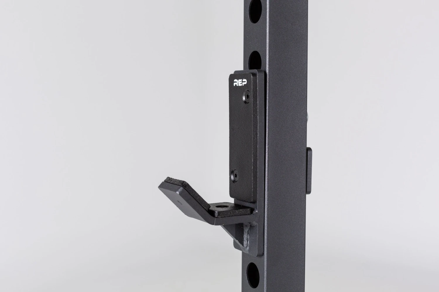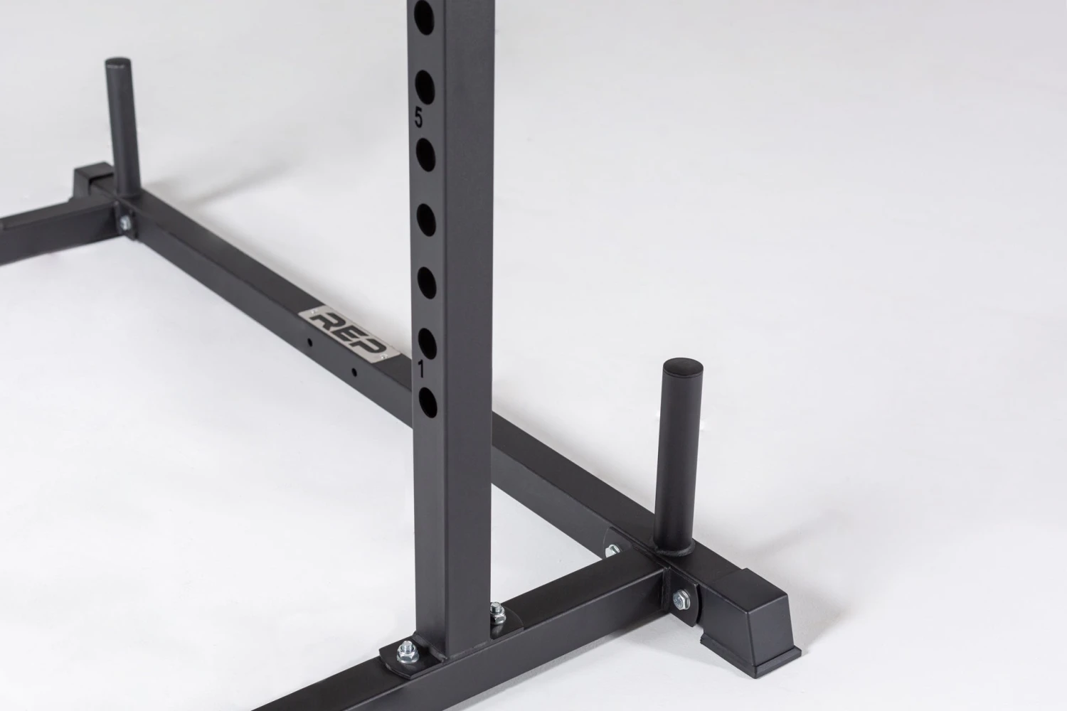 The PR-1000 comes with chrome-coated safeties that extend out beyond the cage to hold an extra barbell, and the J-cups are lined with plastic to protect your bar and the rack’s finish from scratches, rust, and bumps. Laser-engraved numbered uprights allow for quick and accurate height adjustments of safeties and J-cups. The PR-1000 is compatible with a ton of different add-ons, including the dip, lat pulldown, and landmine attachments, as well as more weight storage, different J-cups, cannonball grips, and pin safeties.