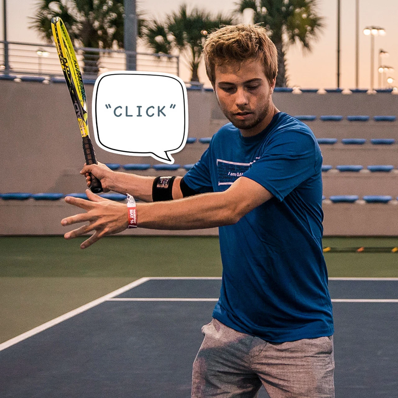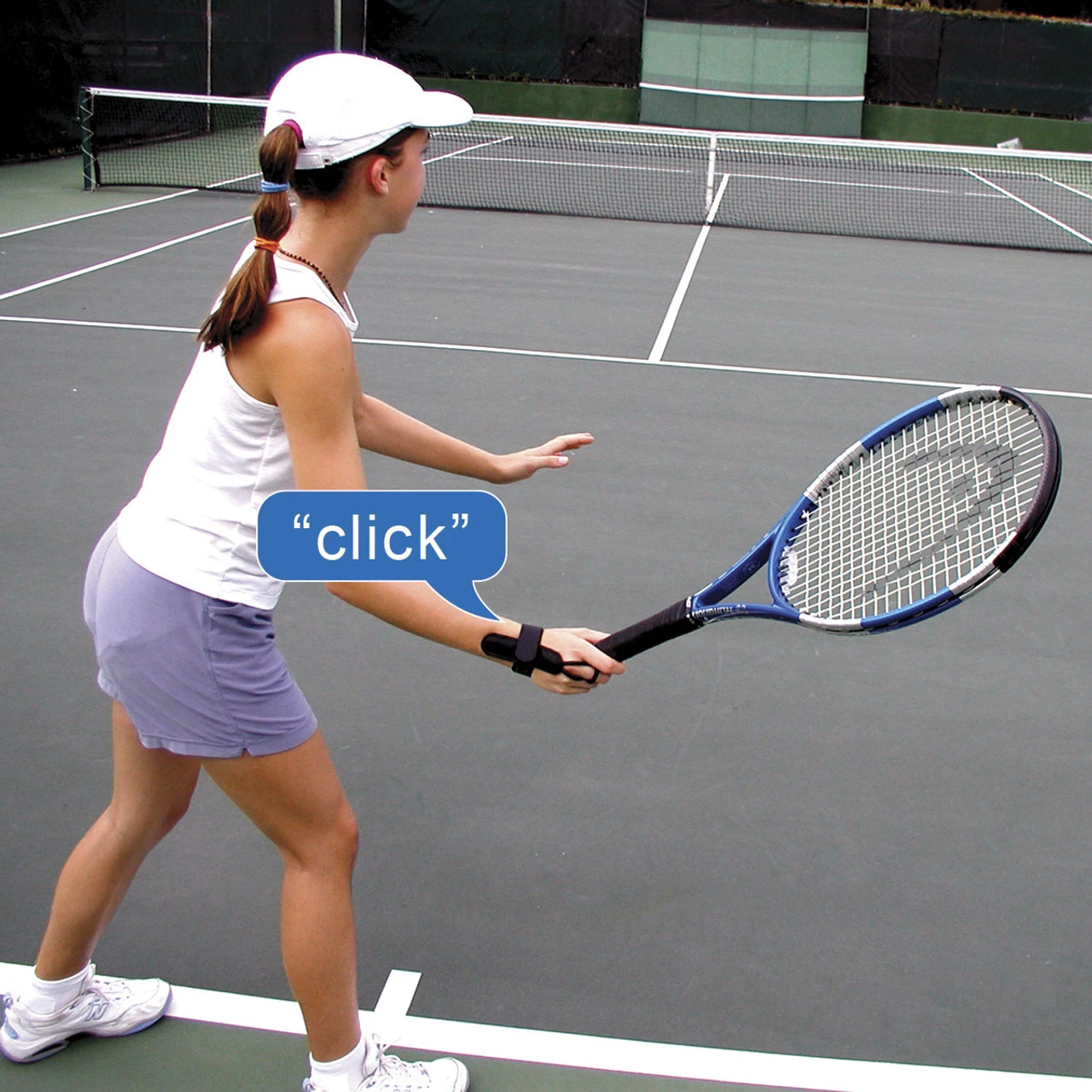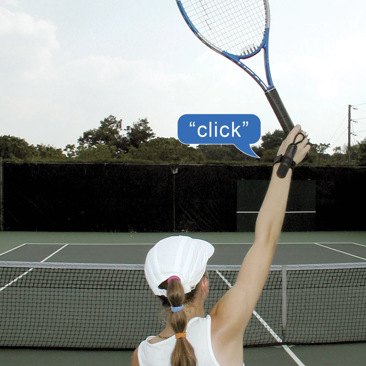 Click your way to better tennis! The Tac-Tic Wrist Trainer is an amazing kinesthetic aid that uses auditory bio-feedback to help players improve faster. Simply put, if the Wrist Trainer clicks at the right moment, the correct technique was used. A complete instruction guide accompanies the Wrist Trainer to help users find those “right moments” to get on track to better tennis. To use, place the device over the top of your wrist with your palm facing down so the Tac-Tic metal insert is midway over the hand and the lower forearm. Hook the loop over your middle finger to secure into position and double loop it for smaller hand sizes. Another amazing innovation from OnCourt OffCourt.