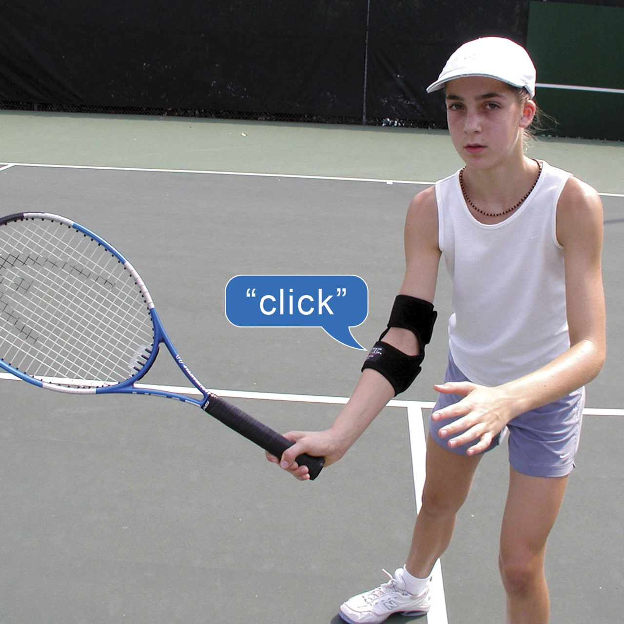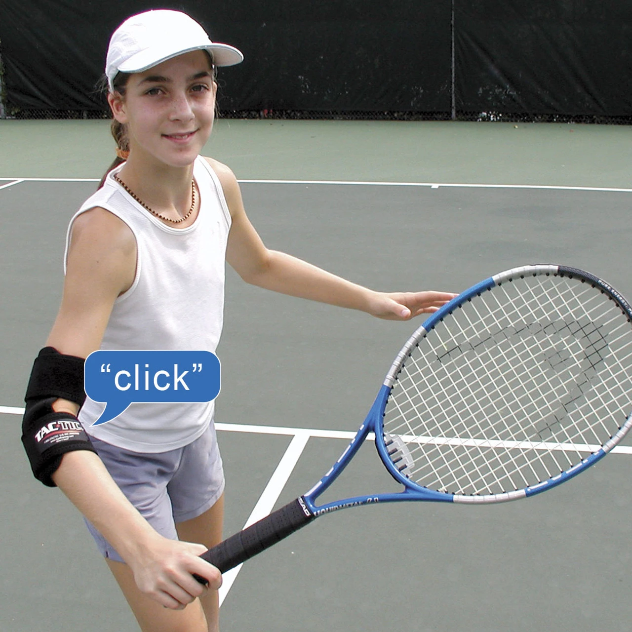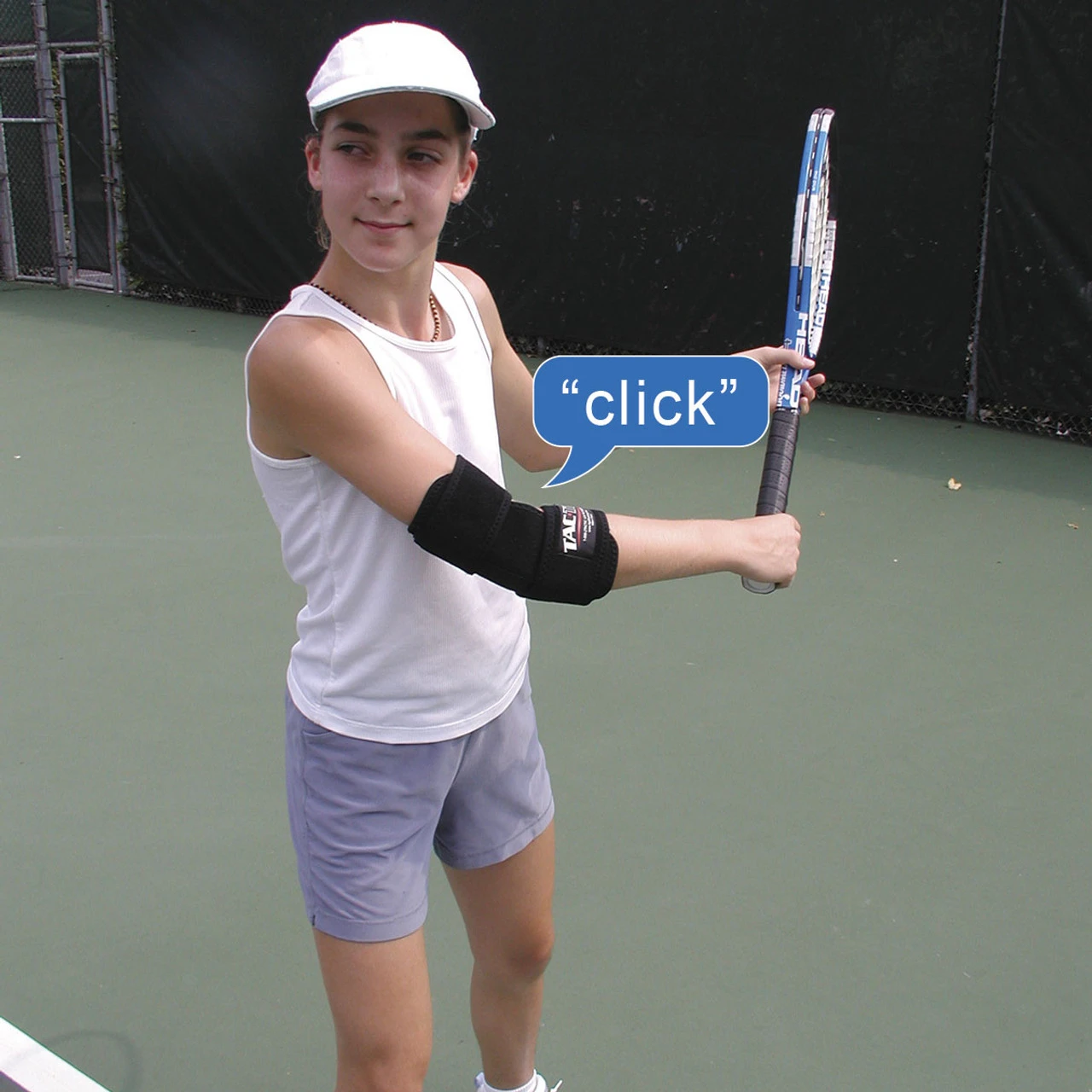 The Tac-Tic Elbow Trainer works like the Wrist Trainer described above, except it guides players to the correct arm position with the elbow. Like the Wrist Trainer, the Tac Tic Elbow Trainer reinforces the right technique by clicking at the right moment. Includes detailed photo instructions by PTR and USPTA Master Pro Joe Dinoffer. To use, just line up the dot on the inside of the Elbow Trainer. Correctly placed, it should click every time you bend or straighten your arm. The Tac Tic Elbow Trainer works great for all strokes, including serves, groundstrokes, and volleys.