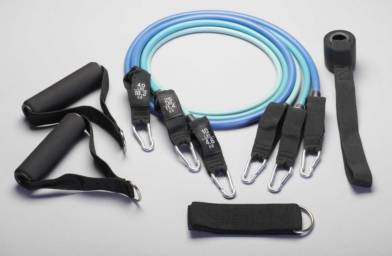 - Includes three (10lb, 25lb and 40lb) resistance tubes with handles, one door anchor, ankle strap and one exercise guide.