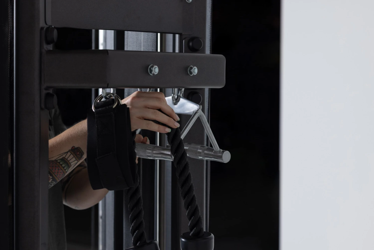 Weighing under 5lbs, the handle is lightweight and easy to store, move, or attach wherever you need it. This attachment is incredibly versatile, depending on how you attach it to the cables and use it. Use the Triangle Row for rows, close-grip chest workouts, lat pulldowns, and more. The widest diameter of the ergo grip is 30mm. The Triangle Row does not come with a carabiner.